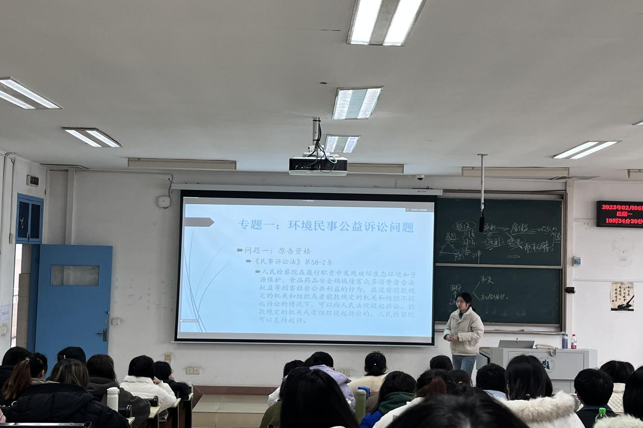 2023年2月6日,公司副董事长钱建国与法公司党委书记郑全新、公司经理邹爱华、公司党委副书记张梦婵、公司副经理江岚、公司副教授徐梦醒一同走进太阳成集团tyc7111cc课堂,聆听公司“开学第一课”——郑若颖老师的《环境法实例研习》。