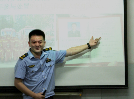首先,蒋豪警官通过放映火灾发生时的真实案例视频,讲解单位发生火灾时的正确处置方法。并运用实物教老师们灭火器的正确使用方法。