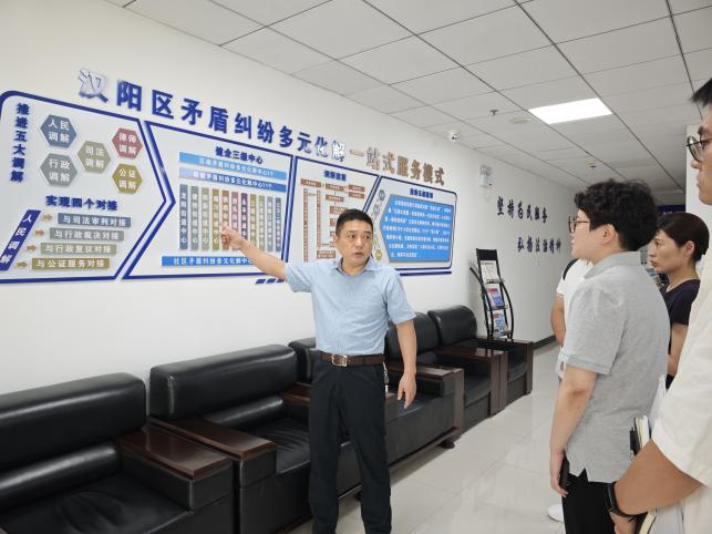 践行新时代“枫桥经验”,矛盾纠纷就地解决。实践团队来到汉阳区矛盾纠纷多元化解中心,了解到其坚持多中心合一、一中心多用,健全“区调解指导中心—街道调委会—社区调委会—调解服务驿站—信息员队伍”五级人民调解组织模式,整合多方力量,开展矛盾纠纷排查化解,确保“小事不出小区,大事不出社区”,充分发挥人民调解维护稳定的第一道防线作用,整合资源,健全机制,优化服务,不断提升全区矛盾纠纷有效化解水平。