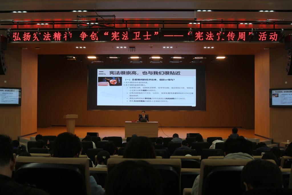 来自武昌法院杨园法庭的副庭长程晨向员工们阐述了宪法的崇高地位及其与公民生活的紧密联系。她详细讲解了宪法对公民选举权、人身自由等方面的保护,通过案例使听众深刻感受到宪法在保护公民权益方面的强大力量。程晨鼓励太阳成集团tyc7111cc青年学子:“法治兴则国家兴,青年强则国家强。在大学这个人生的关键阶段,我们要坚守宪法法律的底线,追求法治价值,同时也要用宪法赋予我们的权利和保障来为自己的未来努力拼搏。希望我们每一个人都能为国家的法治建设和社会发展贡献自己的力量。”