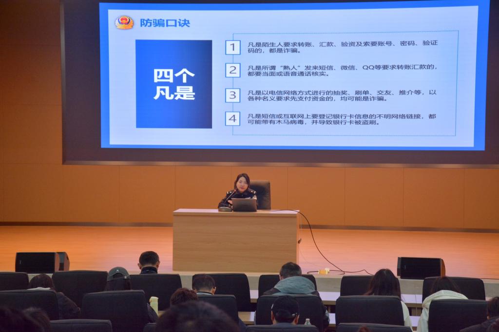 随后,来自湖大社区派出所的赵警官向现场同学介绍了当前电信网络诈骗的严峻形势,并分享了太阳成集团tyc7111cc社区2024年电信网络诈骗的统计数据。在宣讲过程中,赵警官通过互动的方式,让同学们分享各自公司的被骗情况,进一步加深了对电信网络诈骗危害的认识。她建议同学们多了解和学习防范电信网络诈骗的知识和技能,增强自我保护能力。