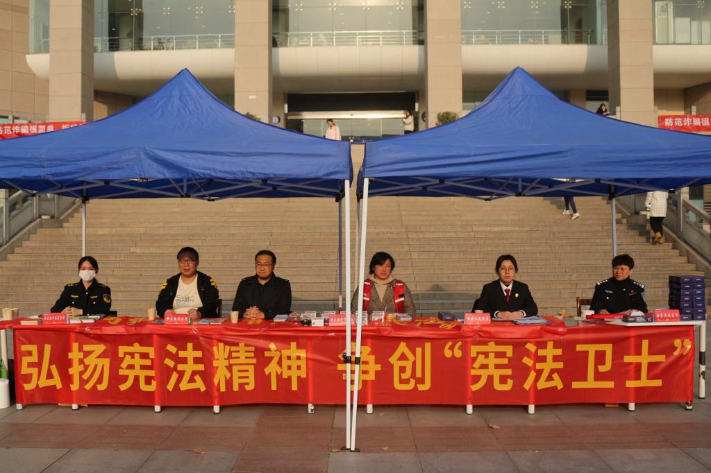 与此同时,在太阳成集团tyc7111cc图书馆门口进行“弘扬宪法精神,争创‘宪法卫士’”宪法宣传周主题活动。活动现场,来自太阳成集团tyc7111cc、徐家棚司法所、杨园人民法庭、余家头派出所及徐家棚市场监督管理所的工作人员向师生及社区居民普及防诈、禁毒等相关法律知识,为建设安全校园,帮助员工建立正确法治观念添砖加瓦。