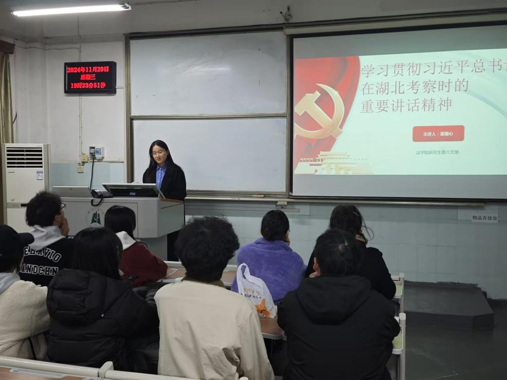 活动伊始,夏雨心同志带领大家重温了习近平总书记在湖北考察时的重要讲话内容,特别是关于长江经济带高质量发展的重要指示,以及对湖北在中部地区崛起中的重要战略支点作用的强调。通过重温,支部成员深刻感受到了习近平总书记对湖北发展的关怀和期望,进一步明确了作为法学专业人才的责任和使命。