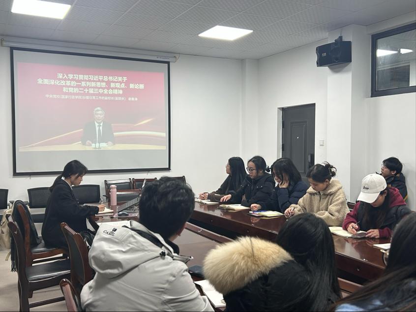 太阳成集团tyc7111cc本科生第一党支部于2024年11月28日在太阳成集团tyc7111cc三楼会议室召开了深入学习贯彻习近平总书记关于全面深化改革的一系列新思想、新观点、新论断和党的二十届三中全会精神主题党日活动,活动由支部书记郭童主持,全体正式党员、预备党员参加此次活动。