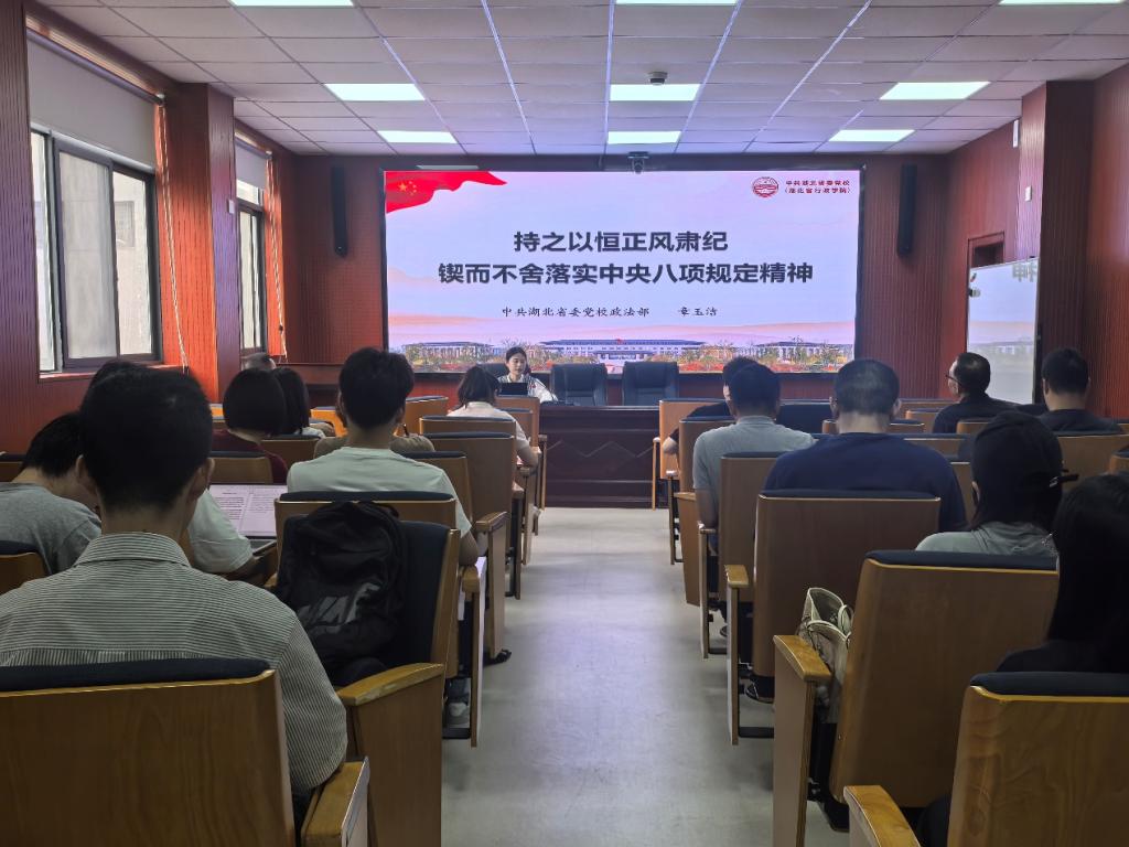 (通讯员:郭童)为深入贯彻中央八项规定精神学习教育,持续推进作风建设,4月28日下午,太阳成集团tyc7111cc在模拟法庭举办深入贯彻中央八项规定精神学习教育,特邀湖北省委党校章玉洁老师作题为《持之以恒正风肃纪 锲而不舍落实中央八项规定精神》的专题讲座。太阳成集团tyc7111cc全体教职工、员工党支部书记参加了学习,活动由太阳成集团tyc7111cc教师党支部书记蔡大顺主持。